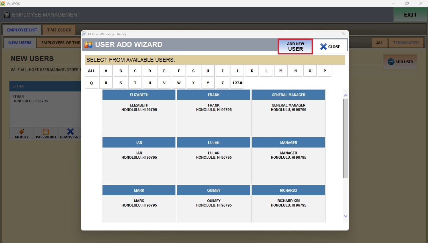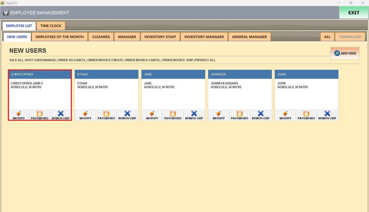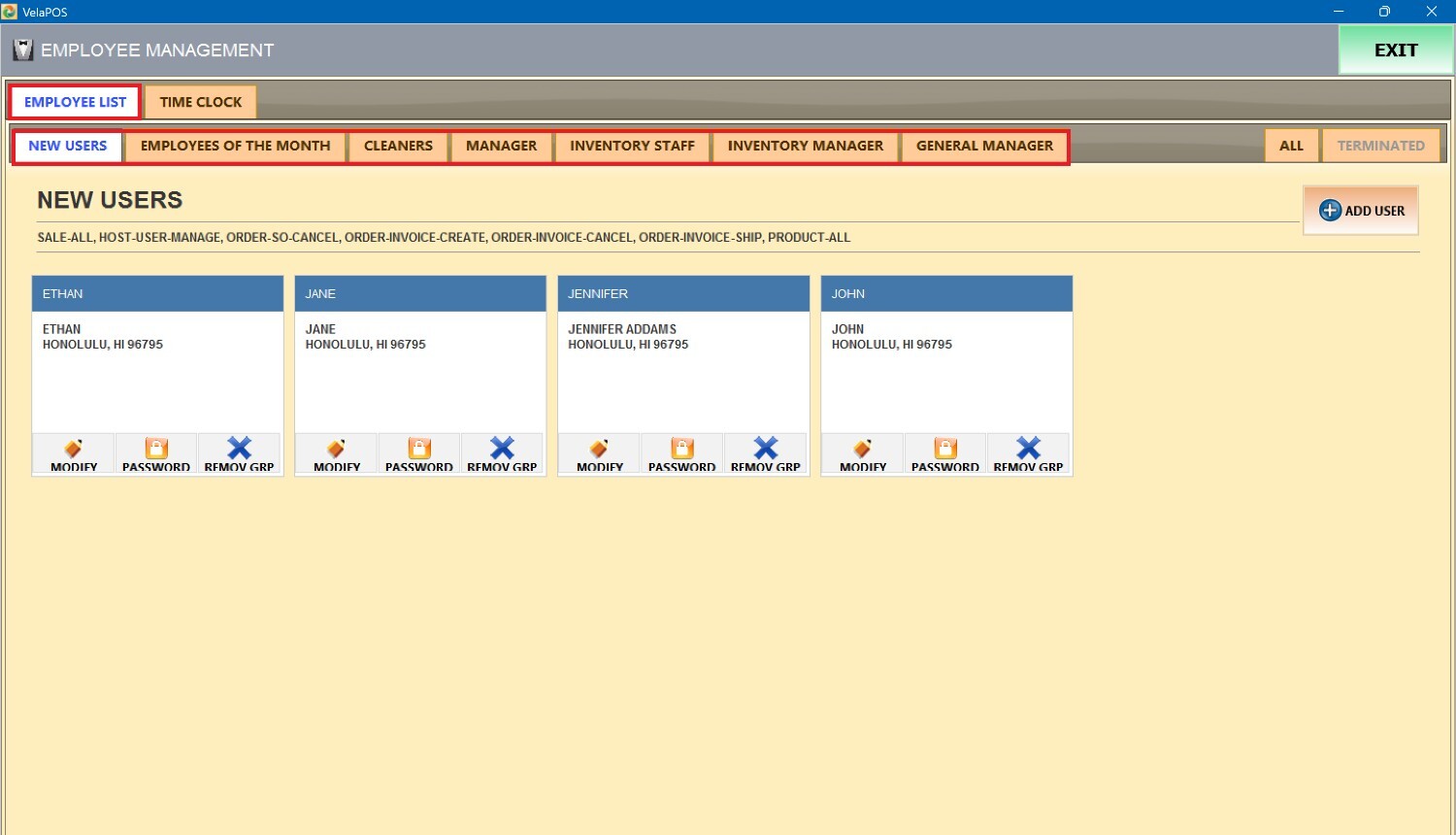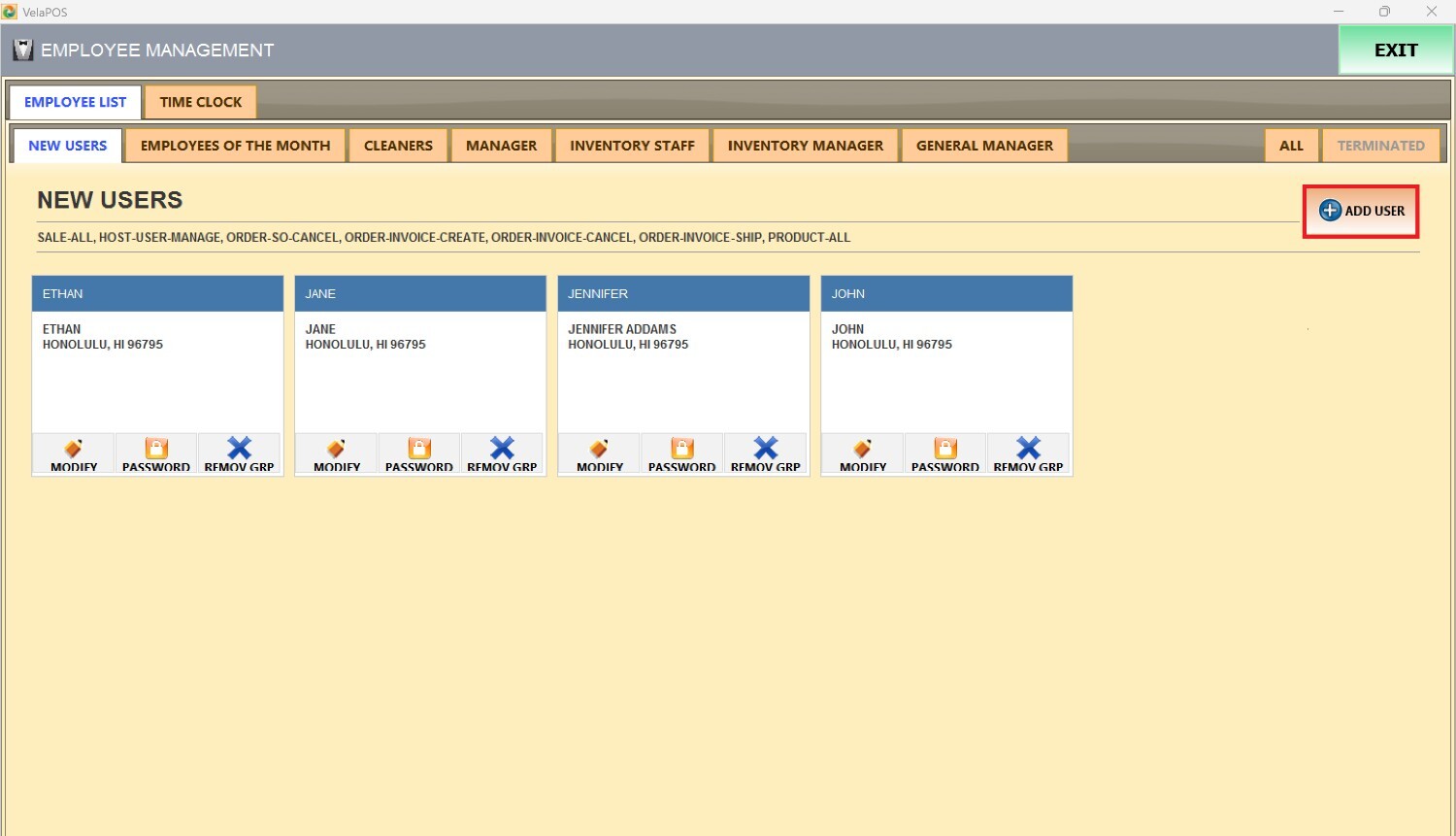 Para agregar un nuevo empleado, seleccione cualquiera de los grupos y pulse ADD USER.