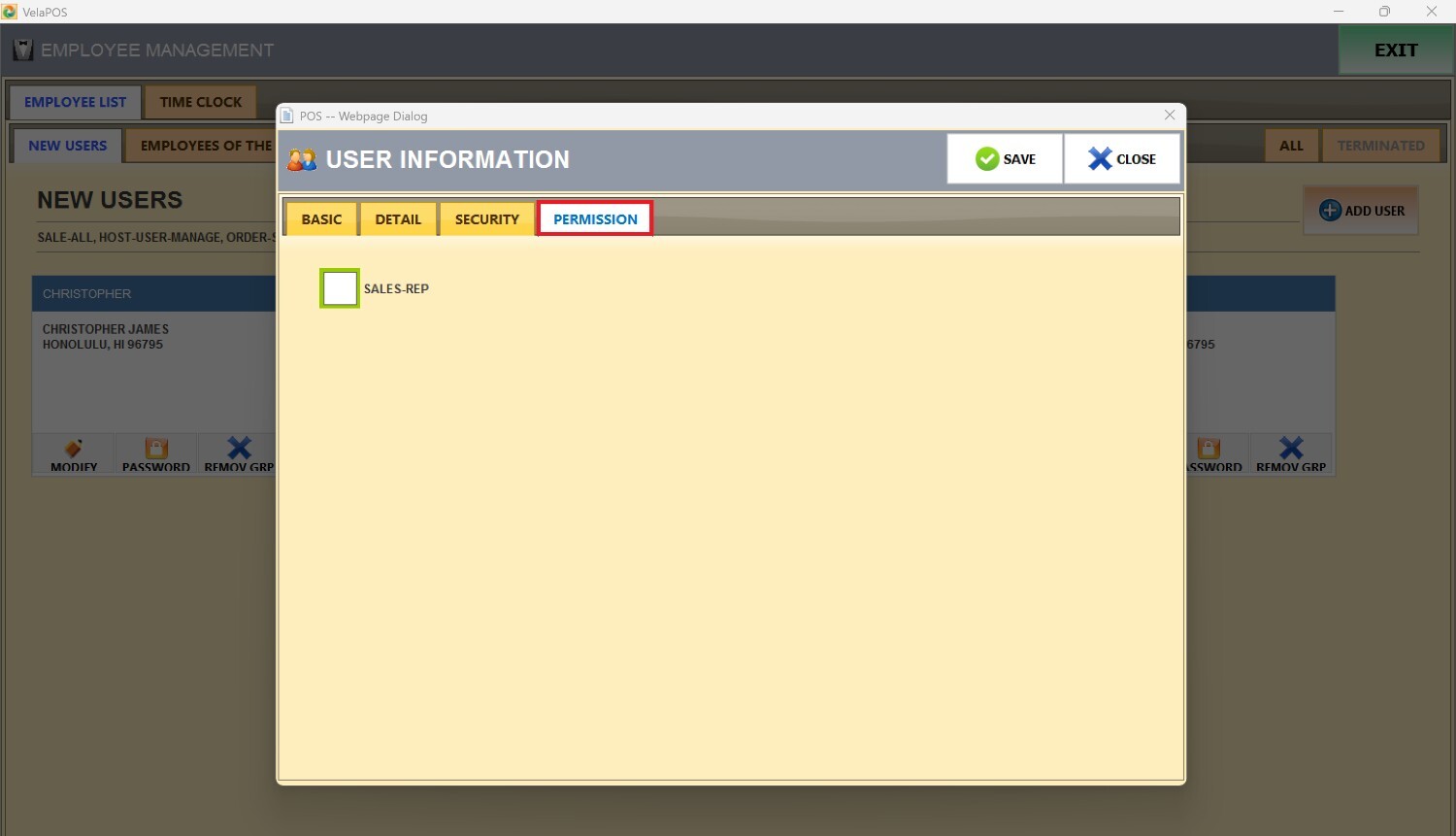 Cada perfil de usuario se organiza en cuatro pestañas: BASIC, DETAIL, SECURITY, y PERMISSION.