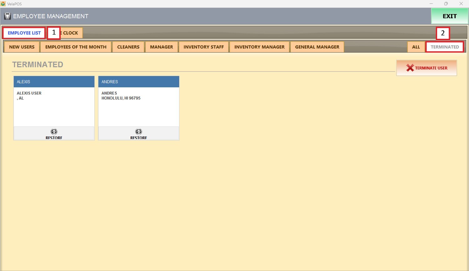 En la EMPLOYEE LIST, pulse TERMINATED para ver los perfiles de los empleados que se han despedido anteriormente.