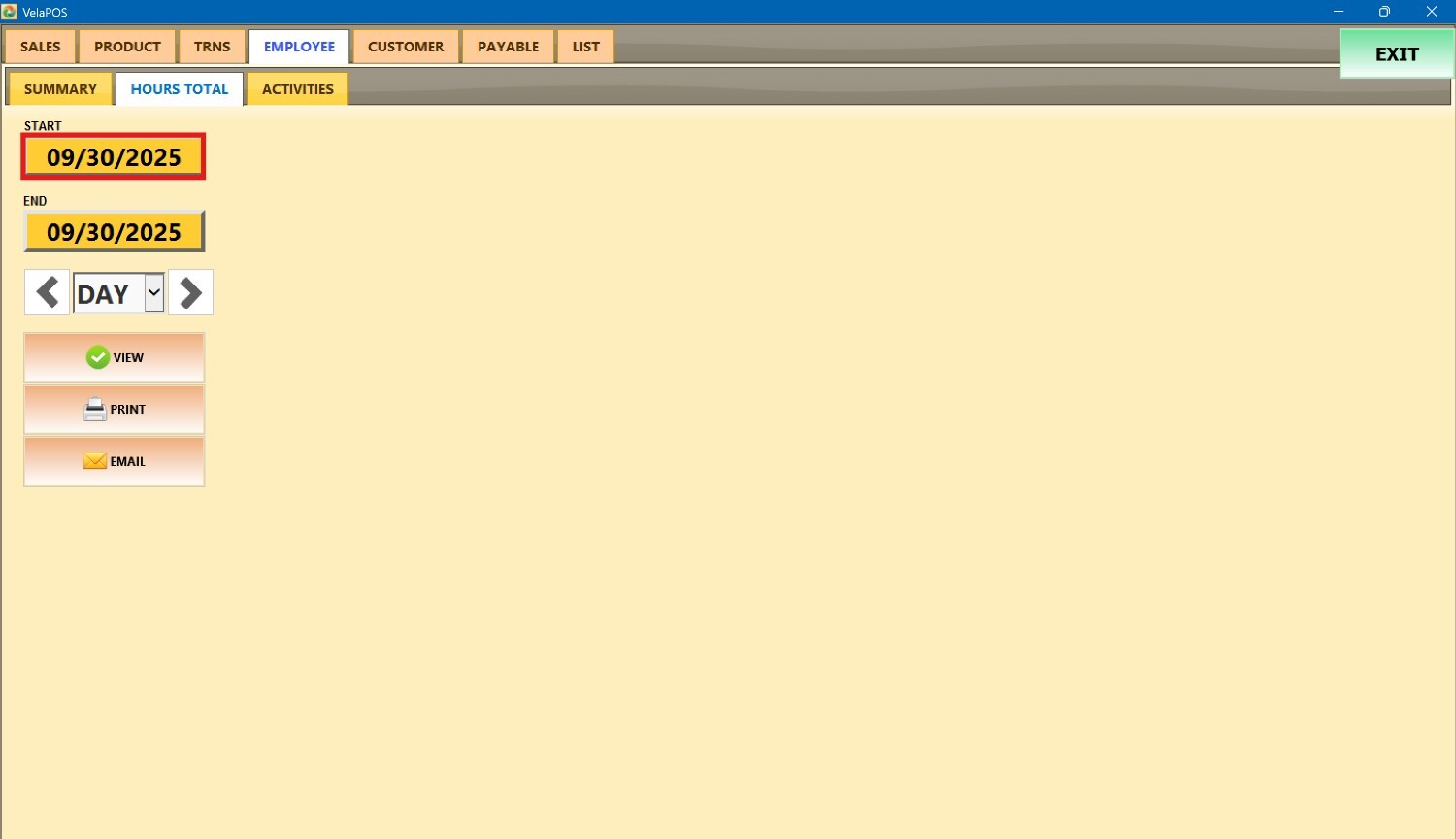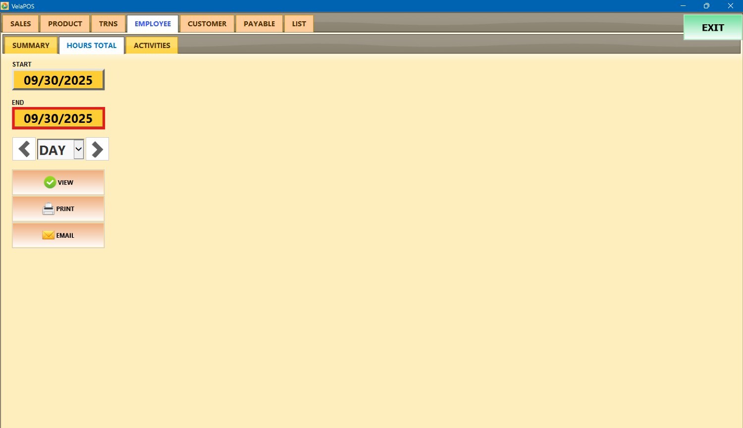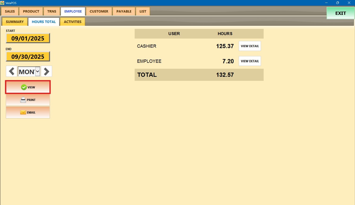 Después de configurar el período, presione VIEW para ver el informe. Una vez generado, puede IMPRIMIRLO o ENVIARLO POR CORREO ELECTRÓNICO.