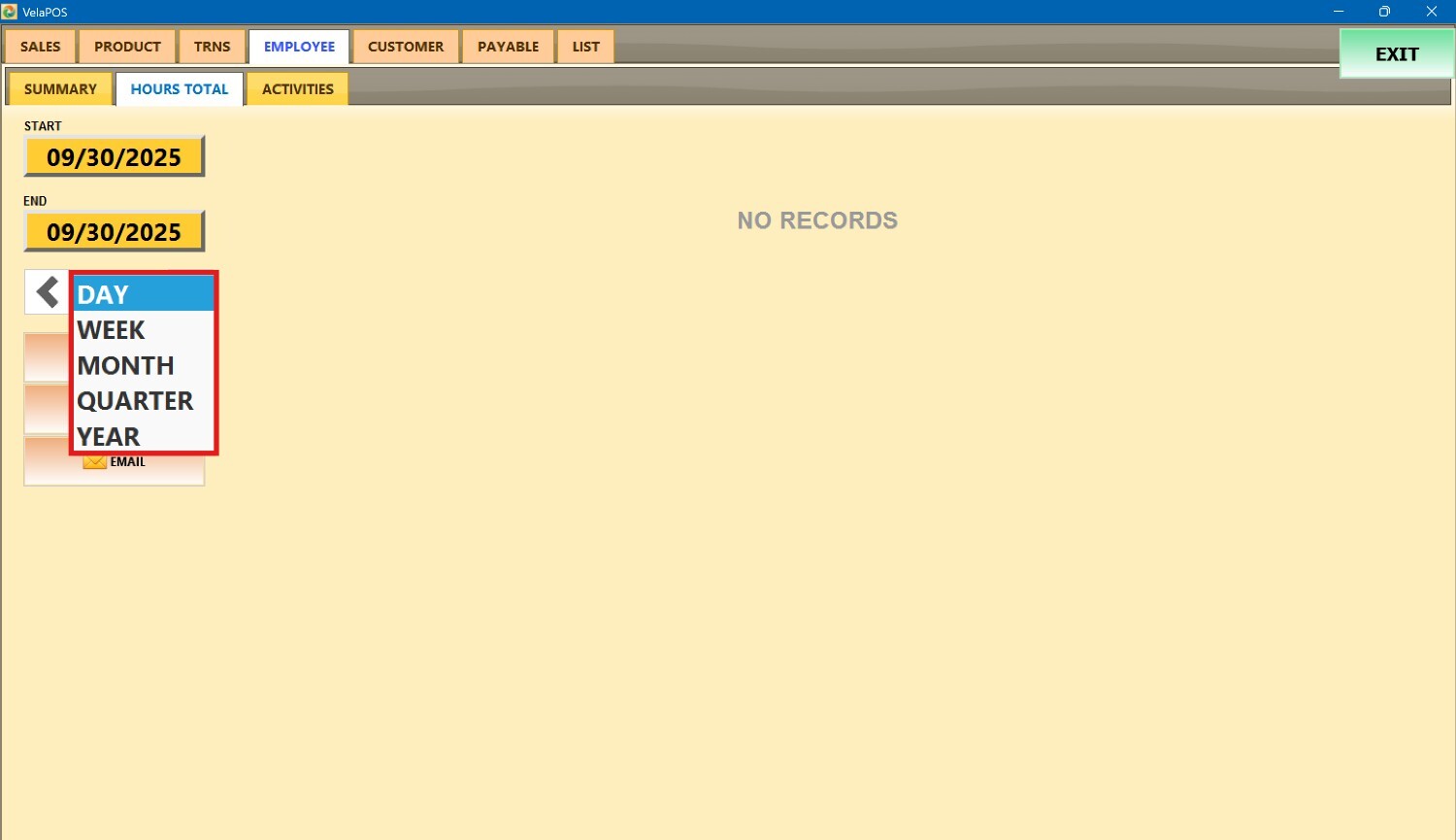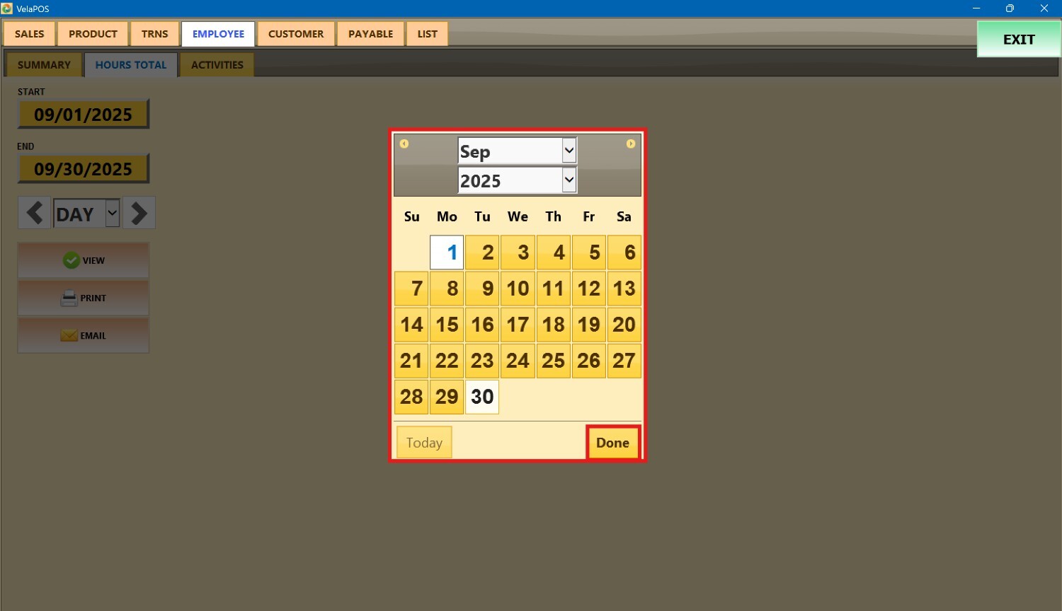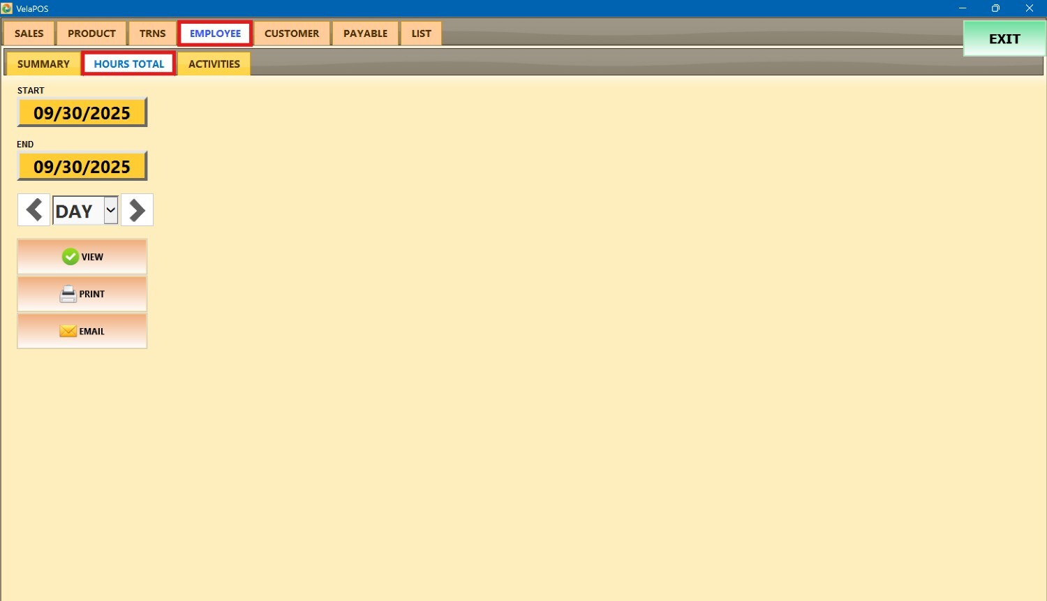 Después de configurar el período, presione VIEW para ver el informe. Una vez generado, puede IMPRIMIRLO o ENVIARLO POR CORREO ELECTRÓNICO.