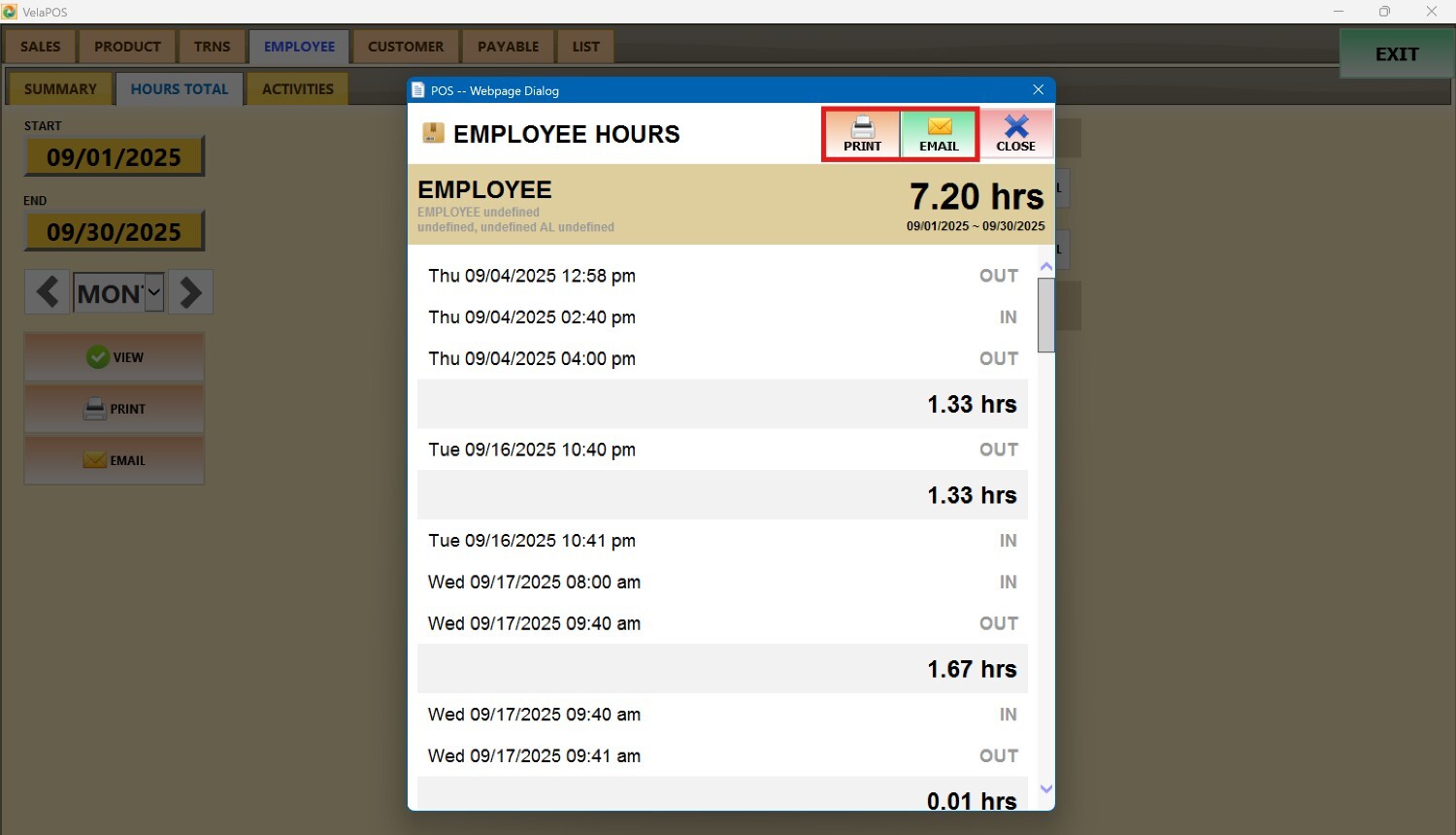 Puede IMPRIMIR o ENVIAR POR CORREO ELECTRÓNICO la información de las horas trabajadas de cada empleado.