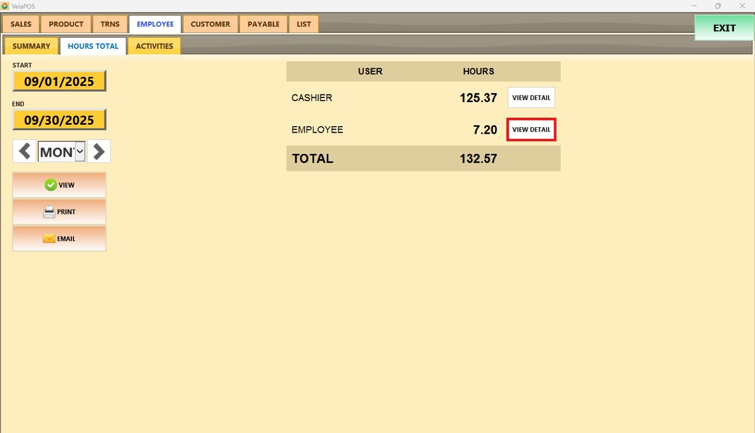 Presione VIEW DETAIL junto a las horas trabajadas por el empleado para ver su historial de entrada, salida y el total de horas trabajadas por turno.