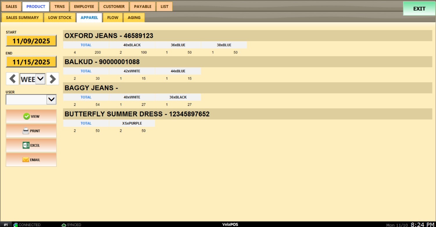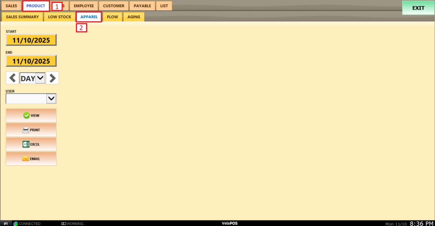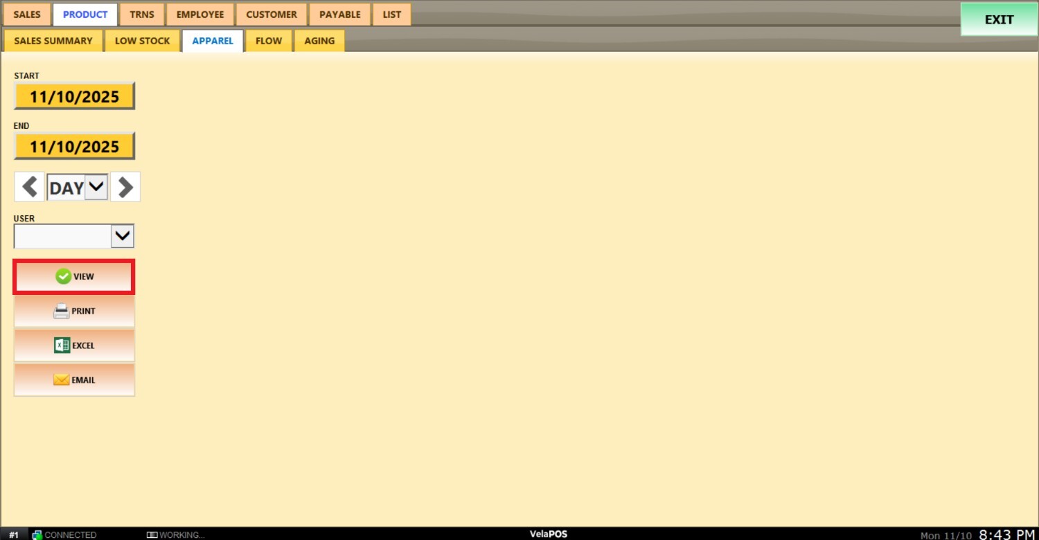 Pantalla Principal MENU> REPORTS> PRODUCT> APPAREL