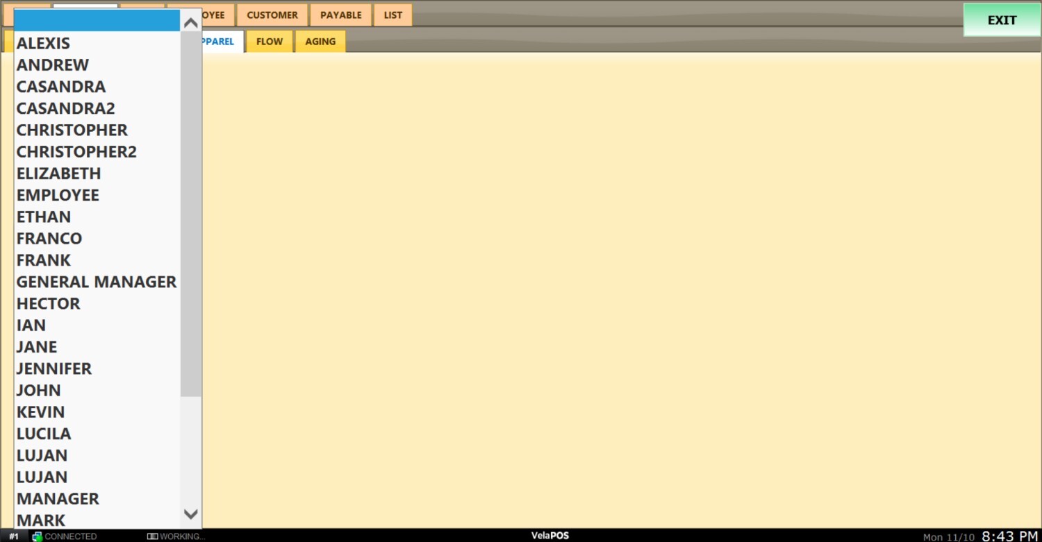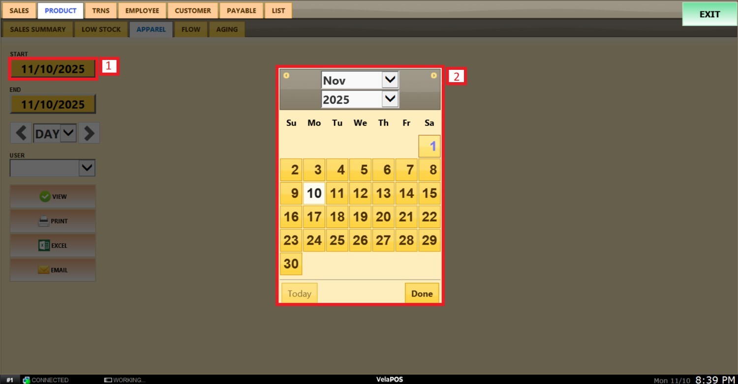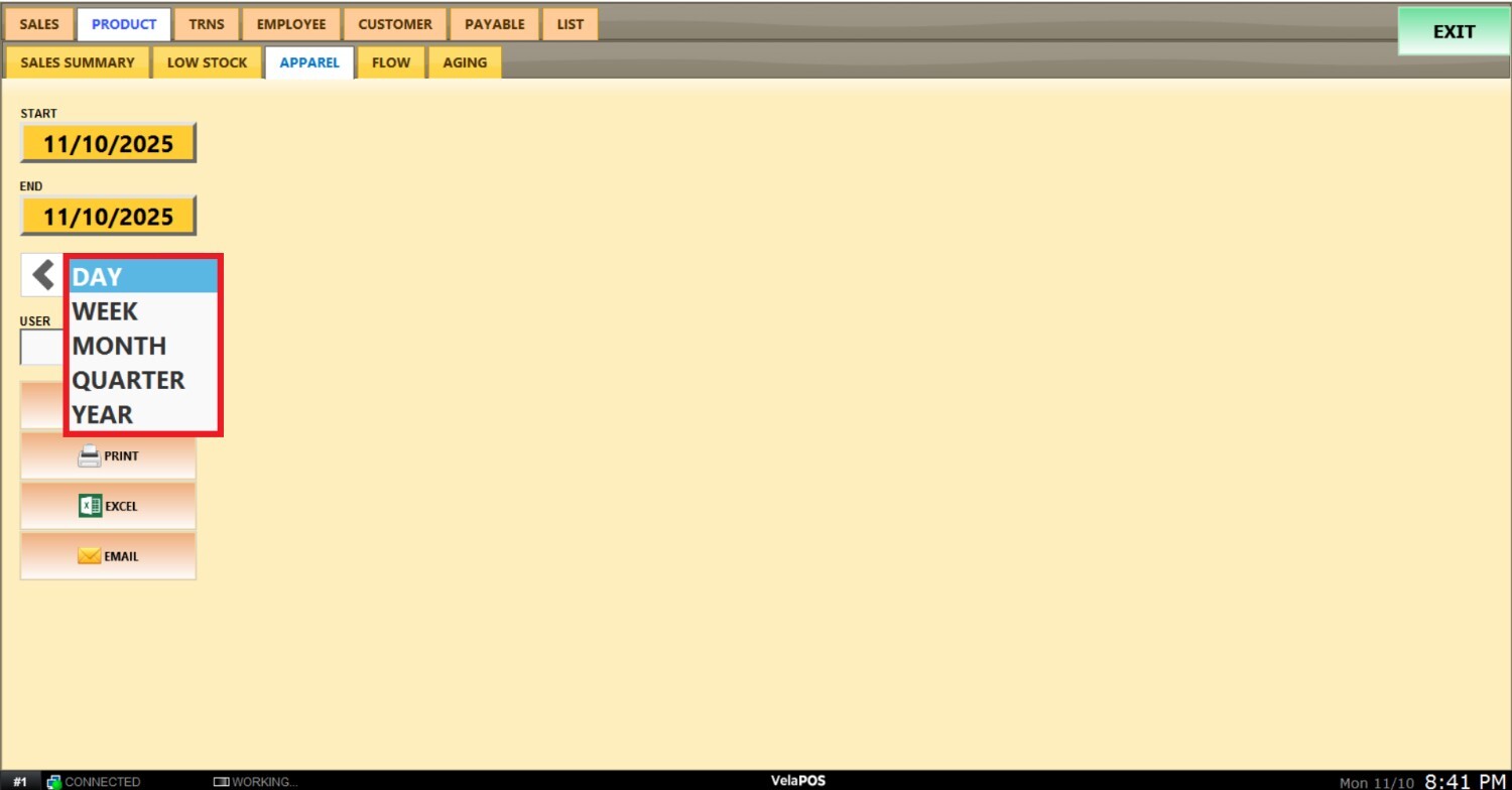 Pantalla Principal MENU> REPORTS> PRODUCT> APPAREL