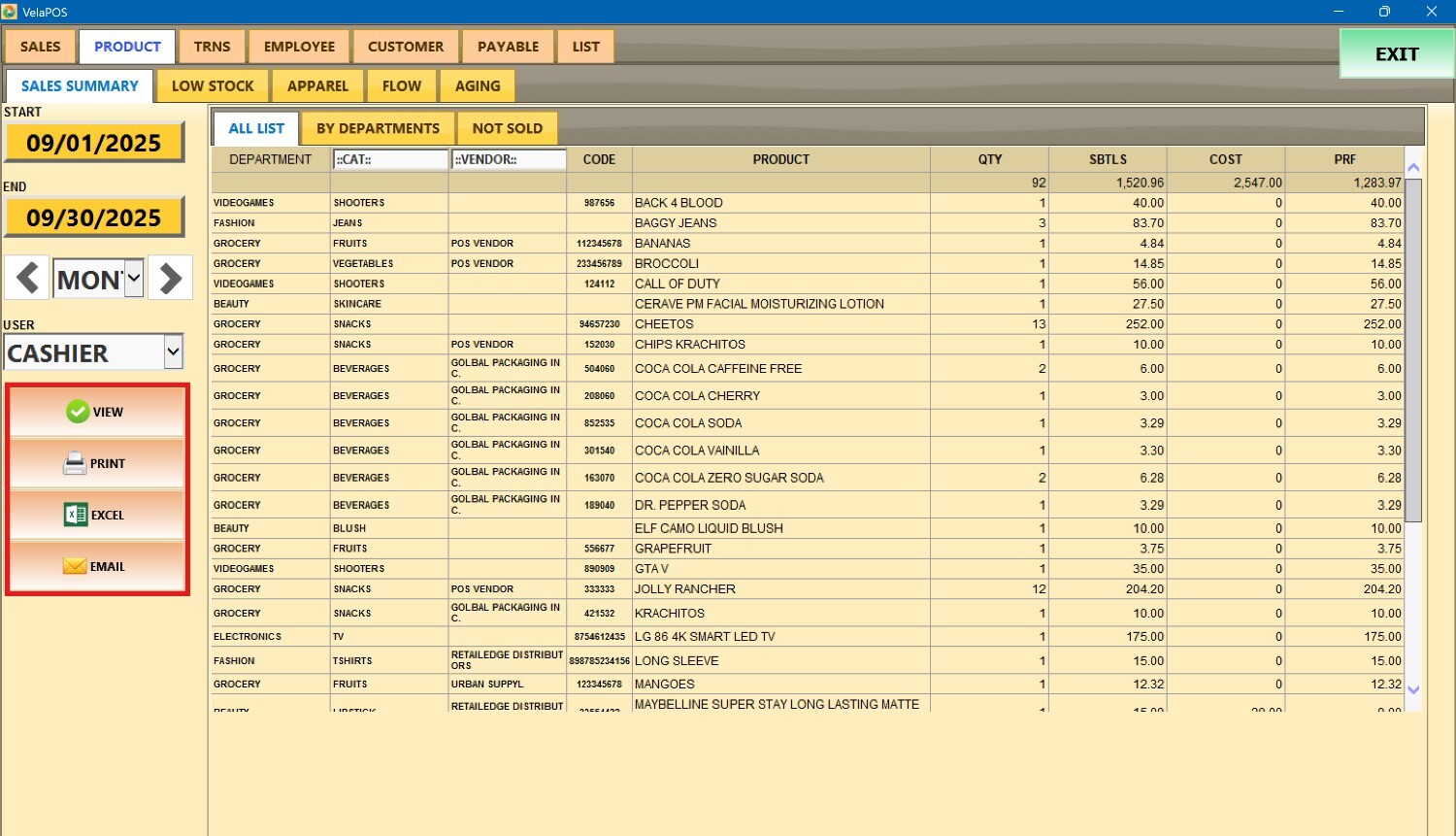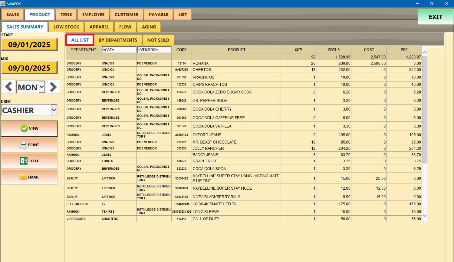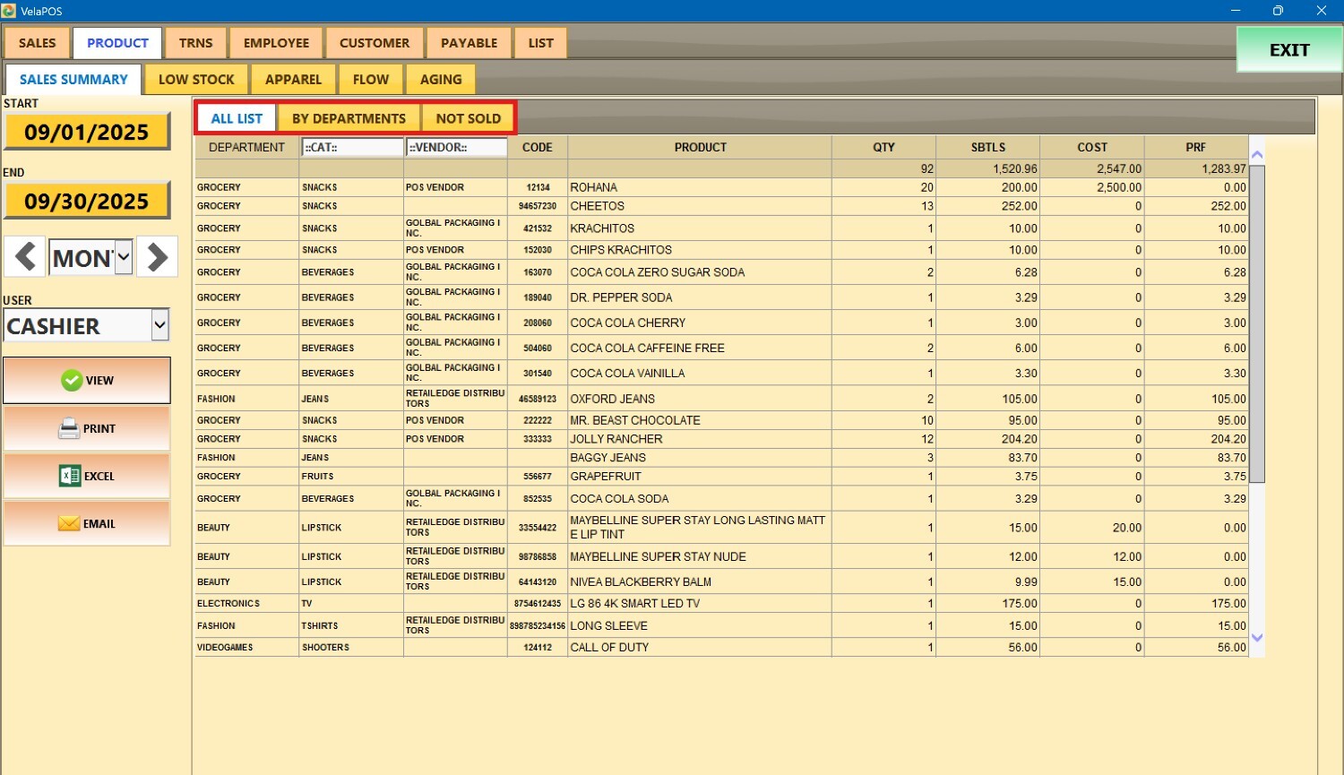 Al pulsar VIEW, el sistema muestra tres pestañas, cada una con una vista diferente de la información del producto: ALL LIST, BY DEPARTMENTS, and NOT SOLD.