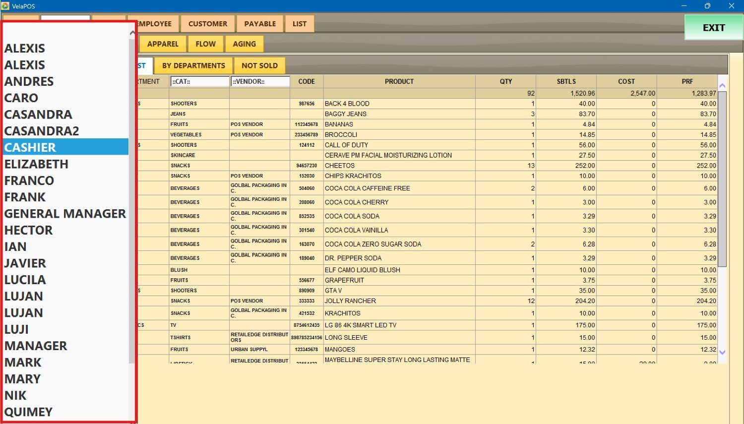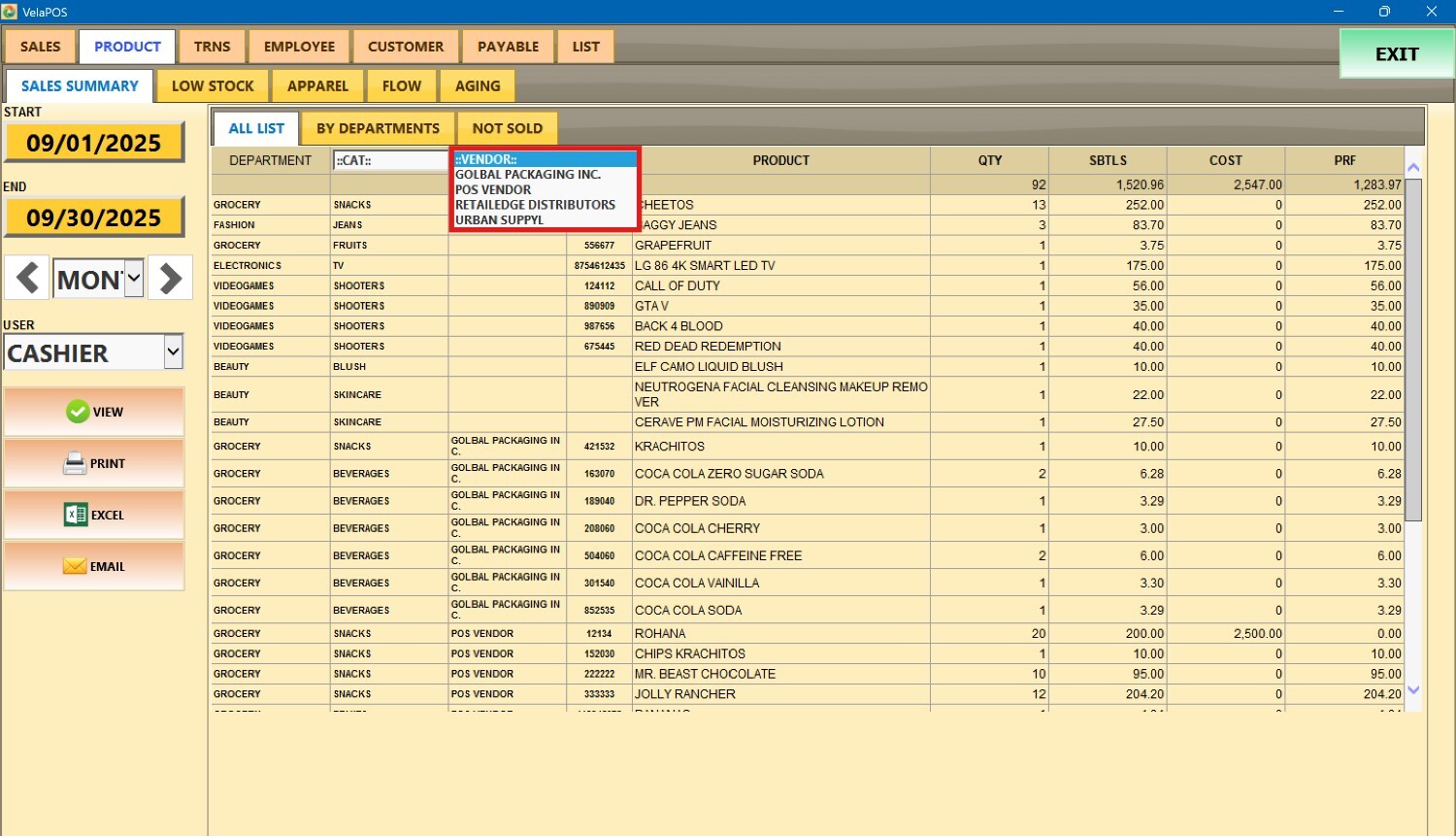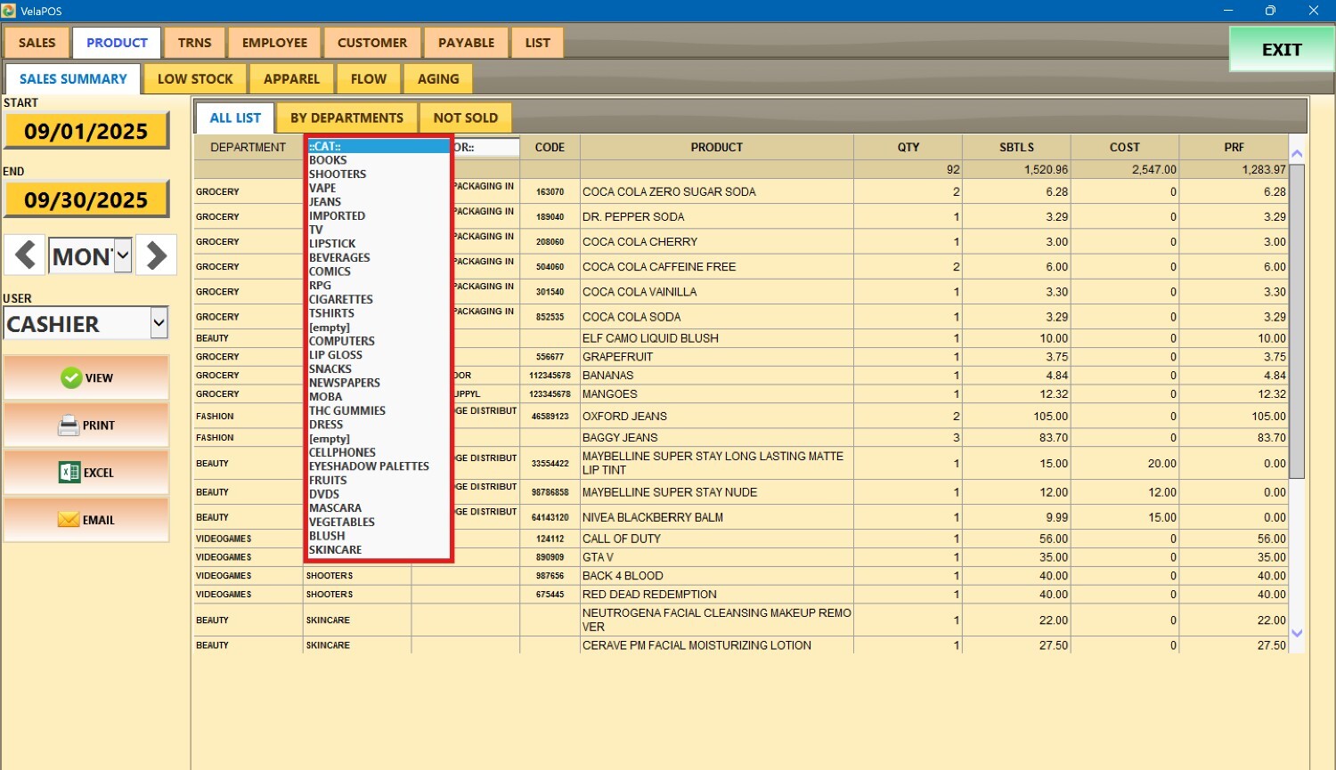 Al pulsar VIEW, el sistema muestra tres pestañas, cada una con una vista diferente de la información del producto: ALL LIST, BY DEPARTMENTS, and NOT SOLD.