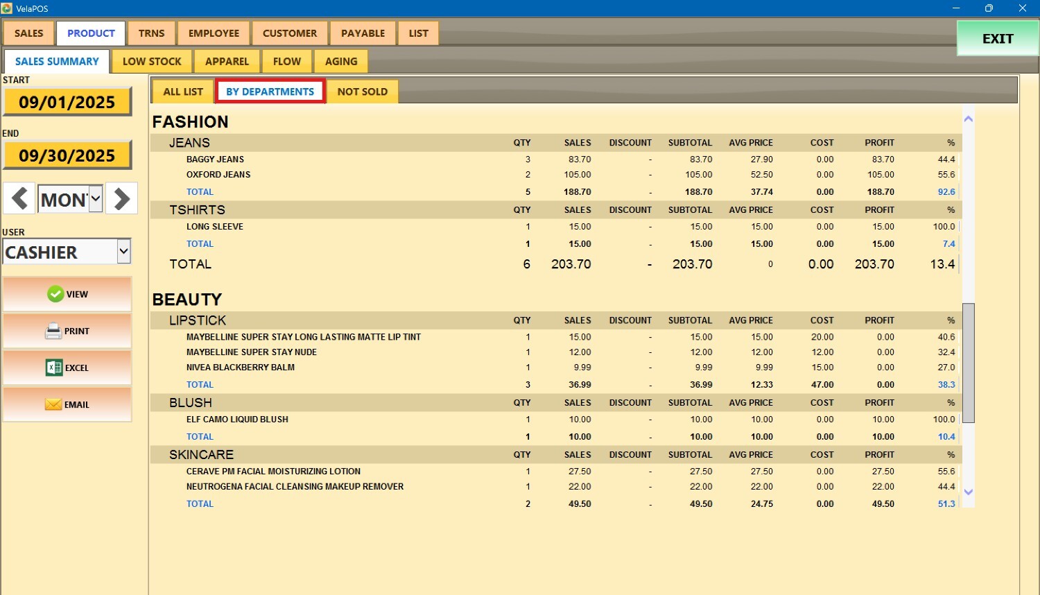 Muestra las ventas de productos por departamento. El informe incluye cantidad vendida, ventas totales, descuentos aplicados, subtotal, precio promedio, costo y beneficio.