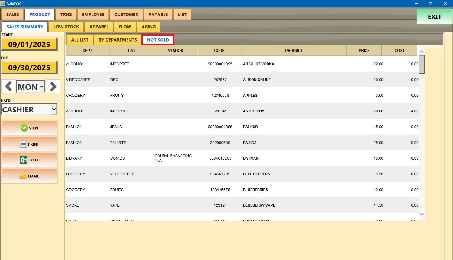 Muestra los productos que no se vendieron en el período seleccionado. Incluye detalles clave como departamento, categoría, proveedor, código de producto, nombre del artículo, precio y coste.