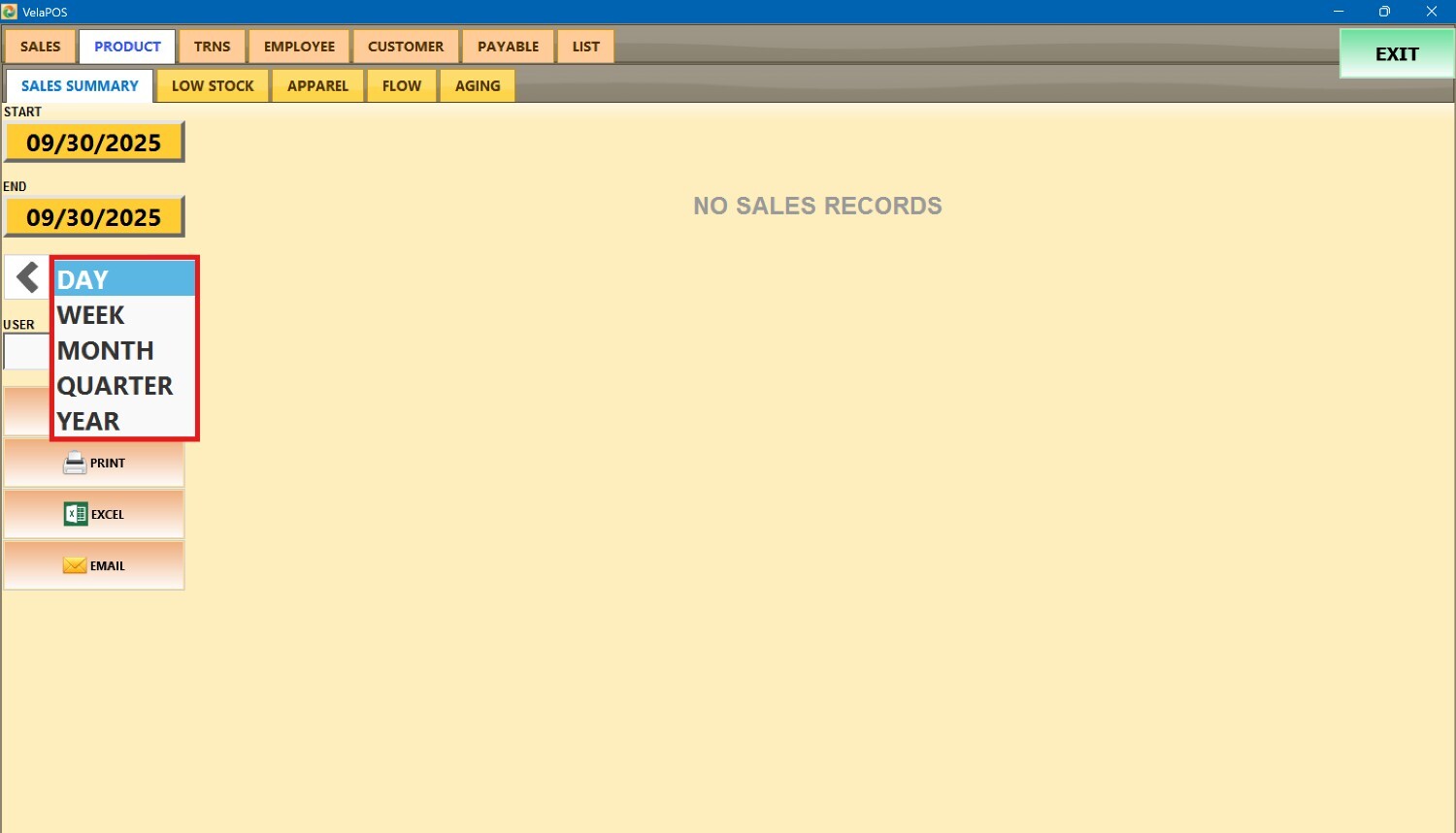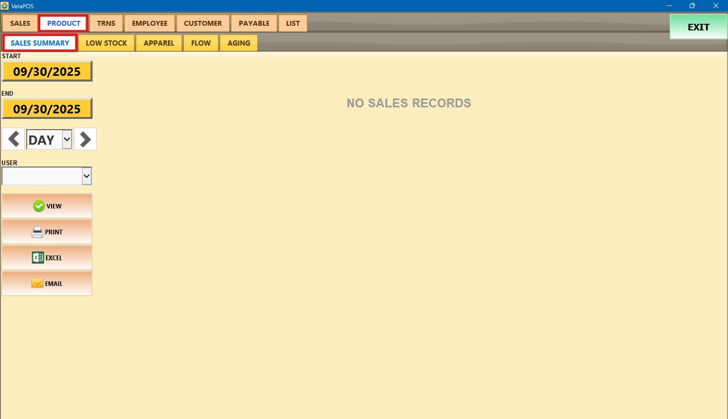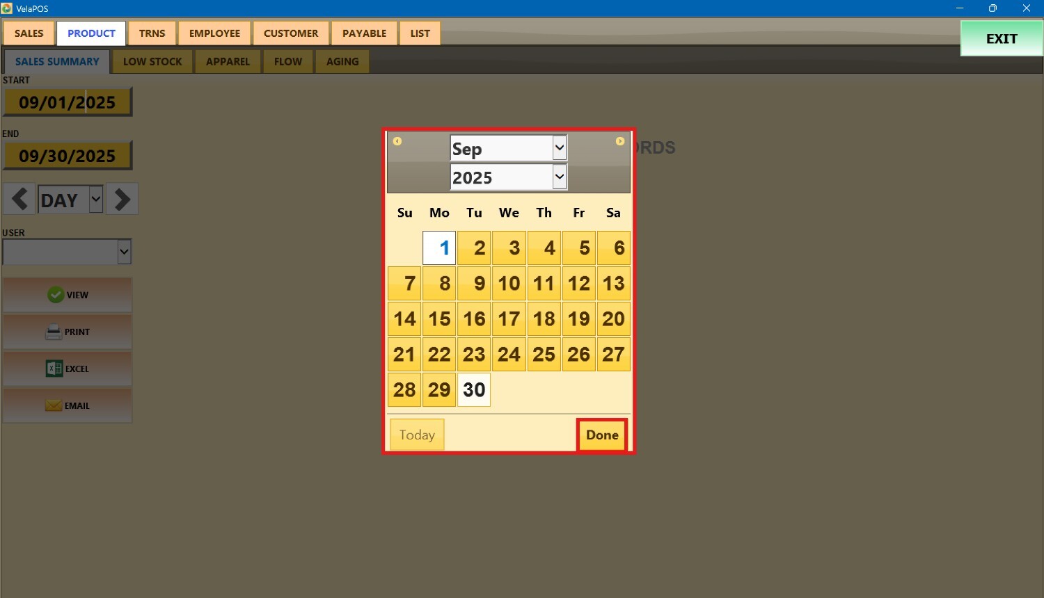 Pantalla Principal> MENU> REPORTS> PRODUCTS> SALES SUMMARY