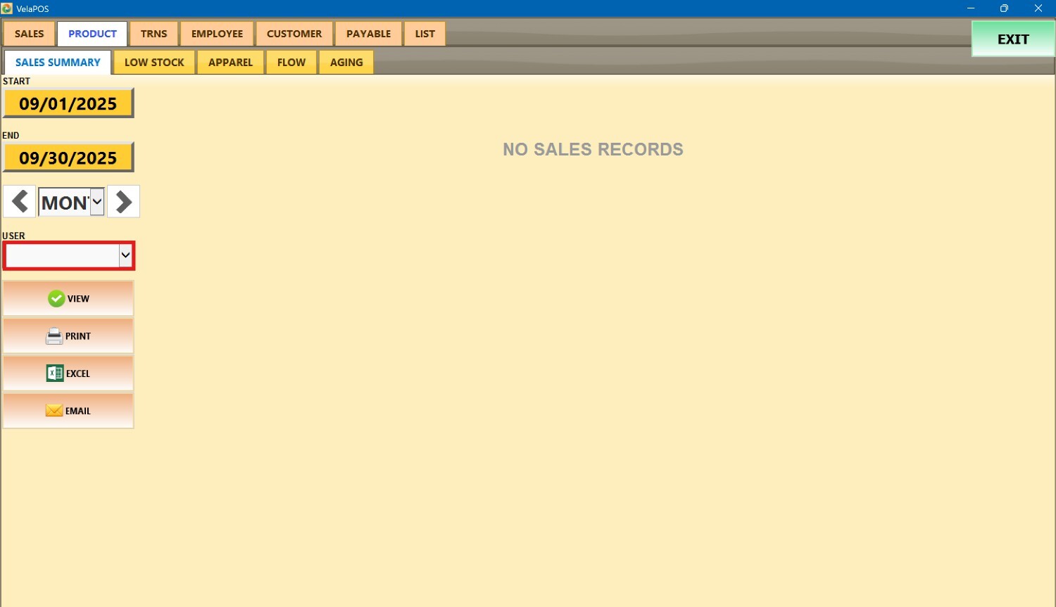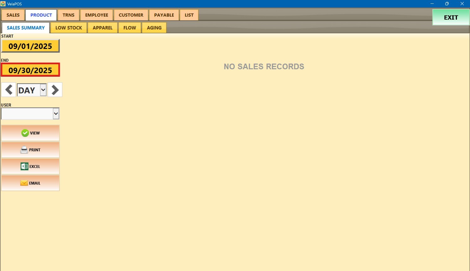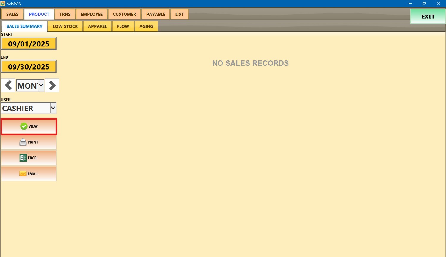 Pantalla Principal> MENU> REPORTS> PRODUCTS> SALES SUMMARY