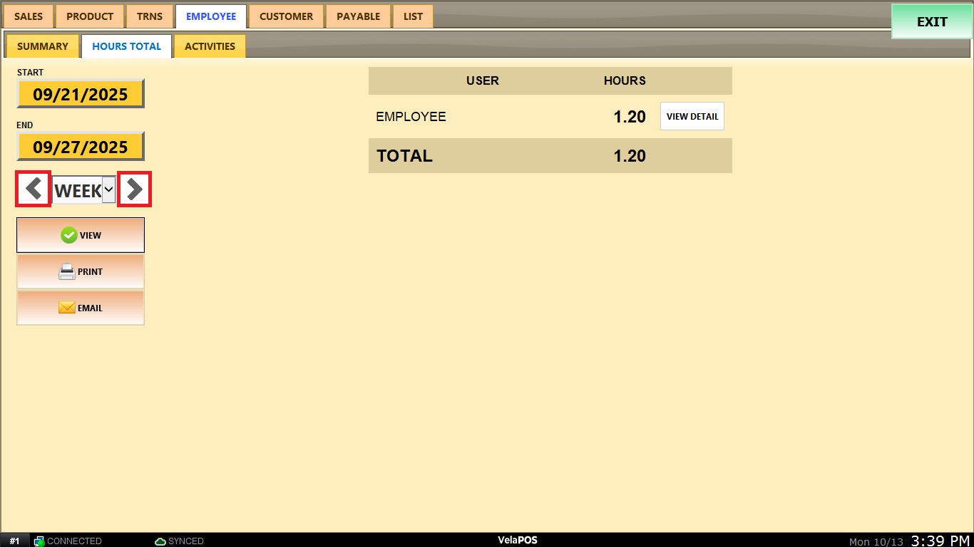 Después de configurar el rango de fechas, el período y el filtro de usuario, presione VIEW para ver el informe según sus selecciones.